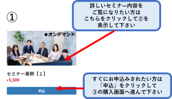 こちらでは、セミナー事例【1】を中心にお申込からご視聴までの流れをご説明いたします。 ※オンラインセミナーへのご参加、無料のサンプルご視聴までの流れもこちらでご説明いたします。